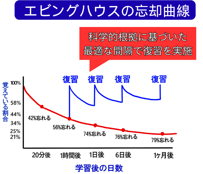 人は1日経つと約7割の内容を忘れてしまうと言われています。最も記憶が定着しやすいタイミングで復習できるよう設計しており、効率よく長期記憶に残る勉強を実現しています。