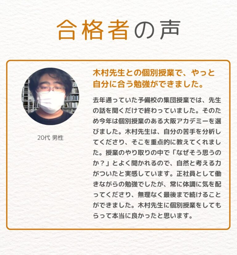 大阪アカデミーに入校を決めた理由はマンツーマンで授業をしてくれるところです。私は大人数で授業をする事が昔から苦手で気になった所などを聞けずにいた事が多々あります。他の予備校では集団で行う授業に対して、大阪アカデミーでは一人一人に寄り添ったスケジュールとメンタルの管理など、絶対に試験を合格に導いてくれる思いが伝わってきました。ここでの1年間、信じて勉強に励んでよかったと思いました。